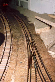 Nachdem der Schattenbahnhof erbaut wurde, machten sich die Mitglieder an den Bau der Hauptstrecke über "Parterre City" nach "Freemont" und dann weiter in Richtung Schlucht.Hier entsteht der Bahnhof "Freemont". Hier zweigt die Nebenlinie in Richtung "St. Barbara" ab. Vorab ist noch die Gleisanlage der Schmalspur-Strecke. Im Hintergrund kreuzt sie die Haupstrecke. Auf dem zweiten Bild sieht man schön, den Eigenbau einer 3-Schienenweiche.